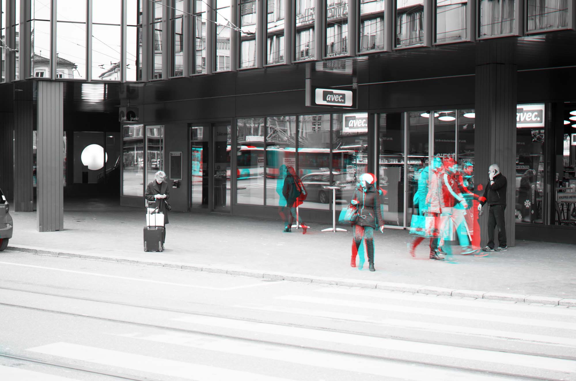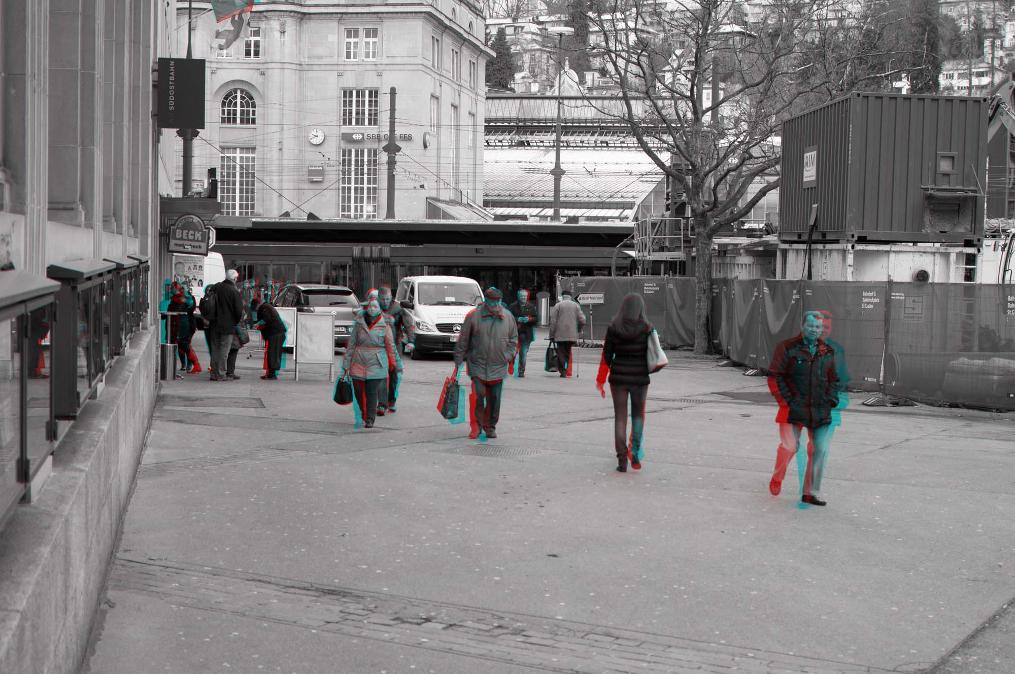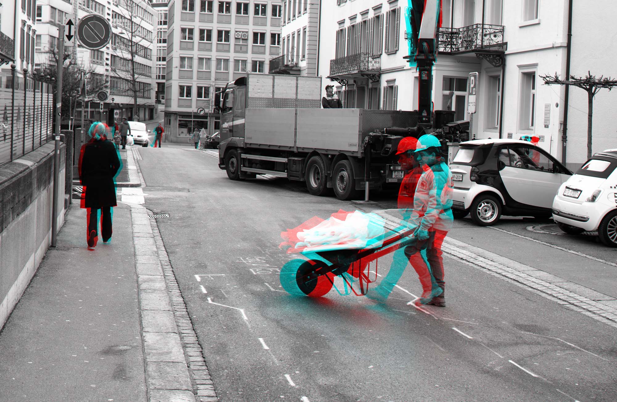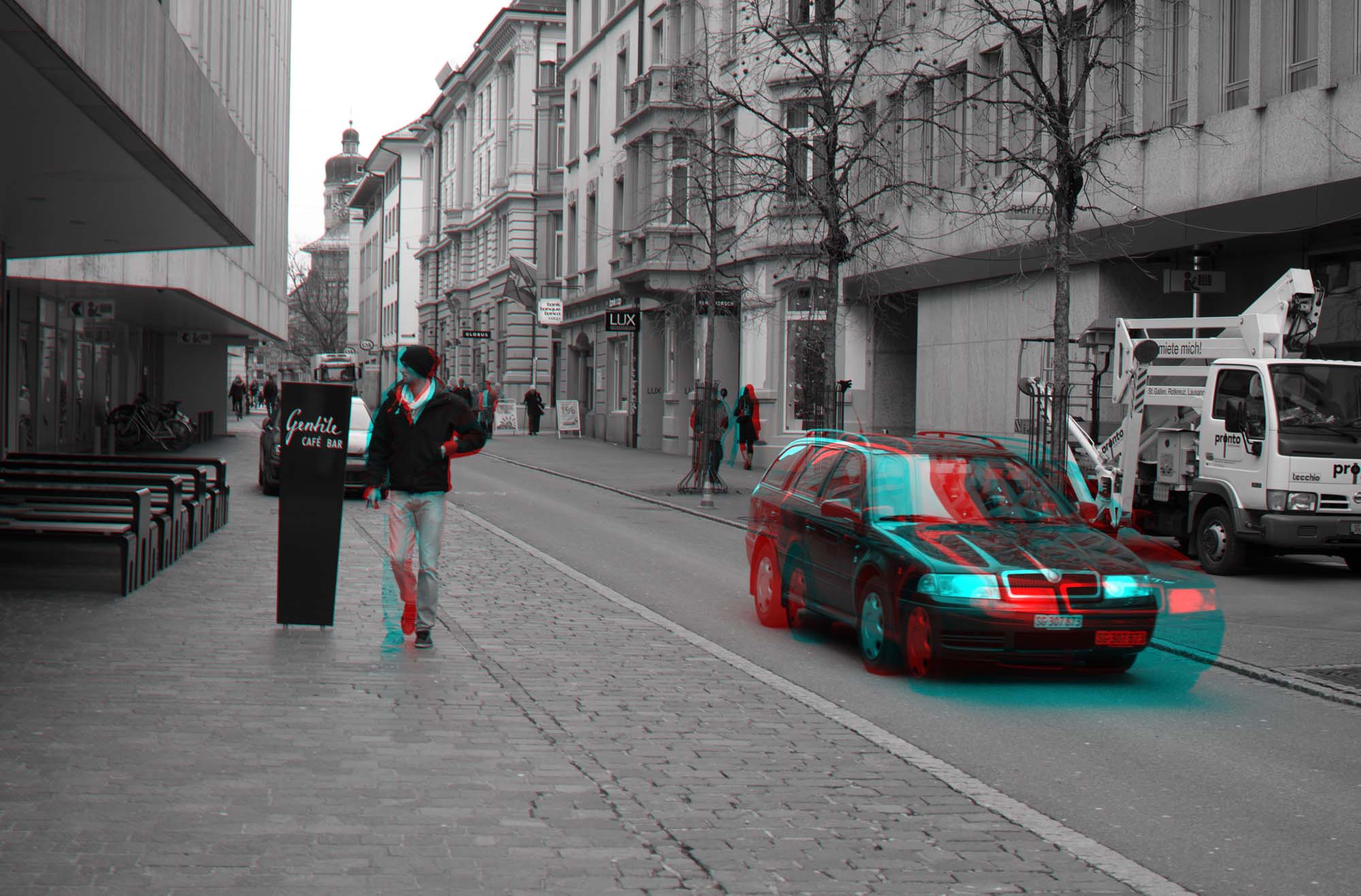 Eine cyan und eine rot eingefärbte Fotografie aus einem kurz versetzten Zeitpunkt ermöglichen in dieser Überlagerung die dreidimensionale Darstellung von Bewegung.