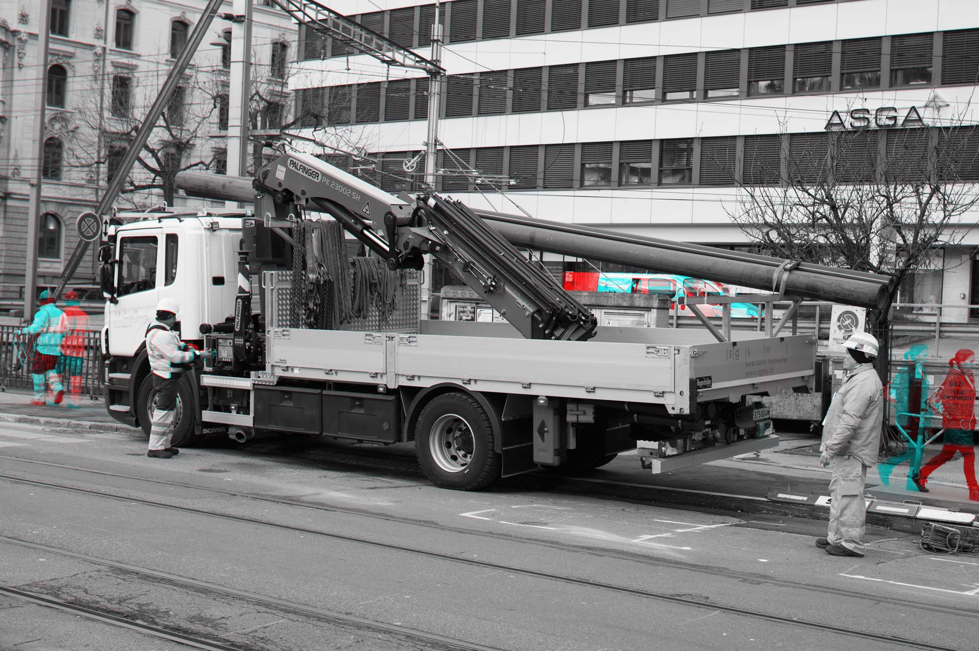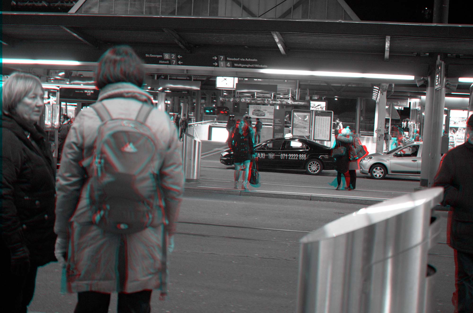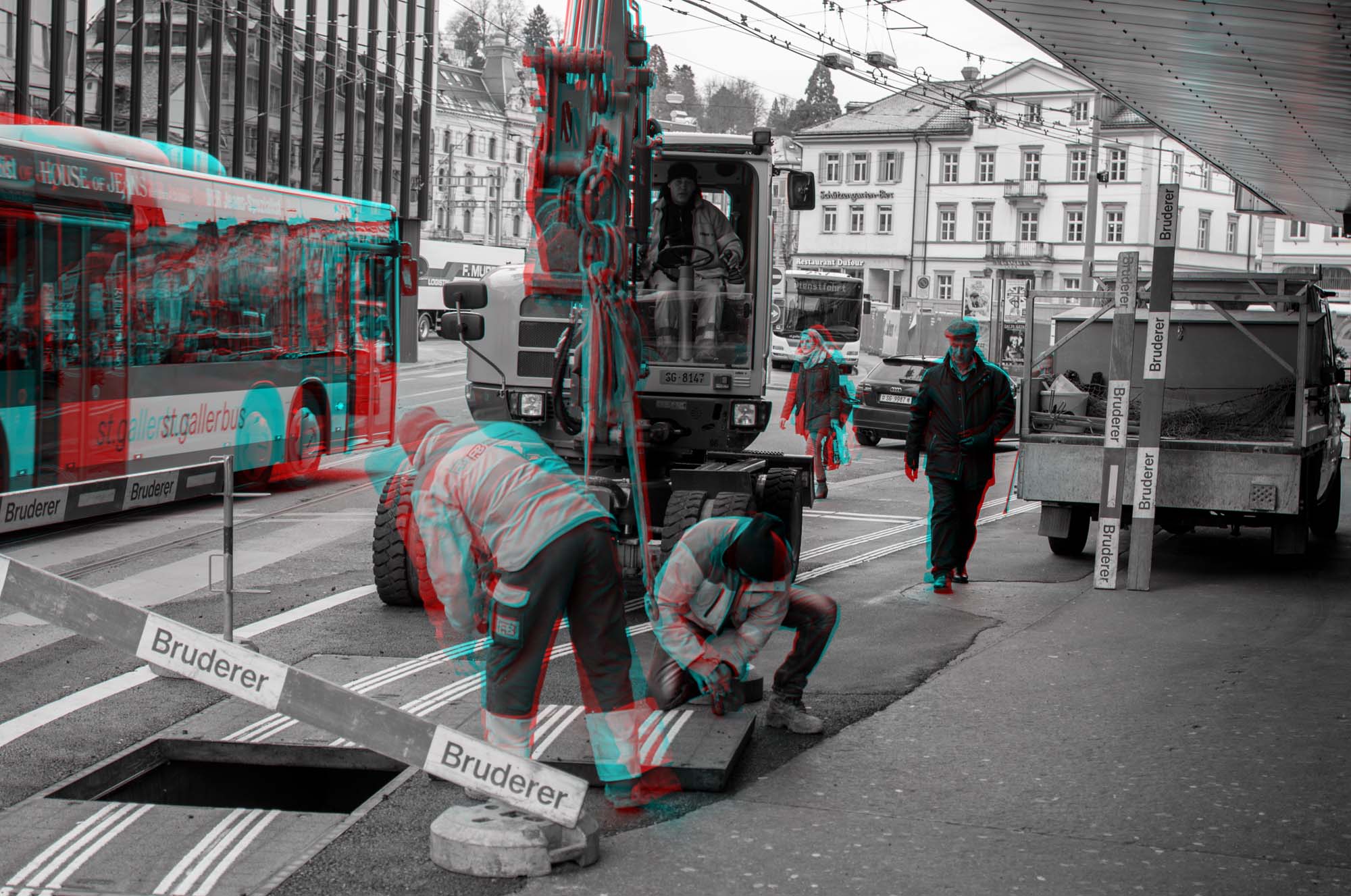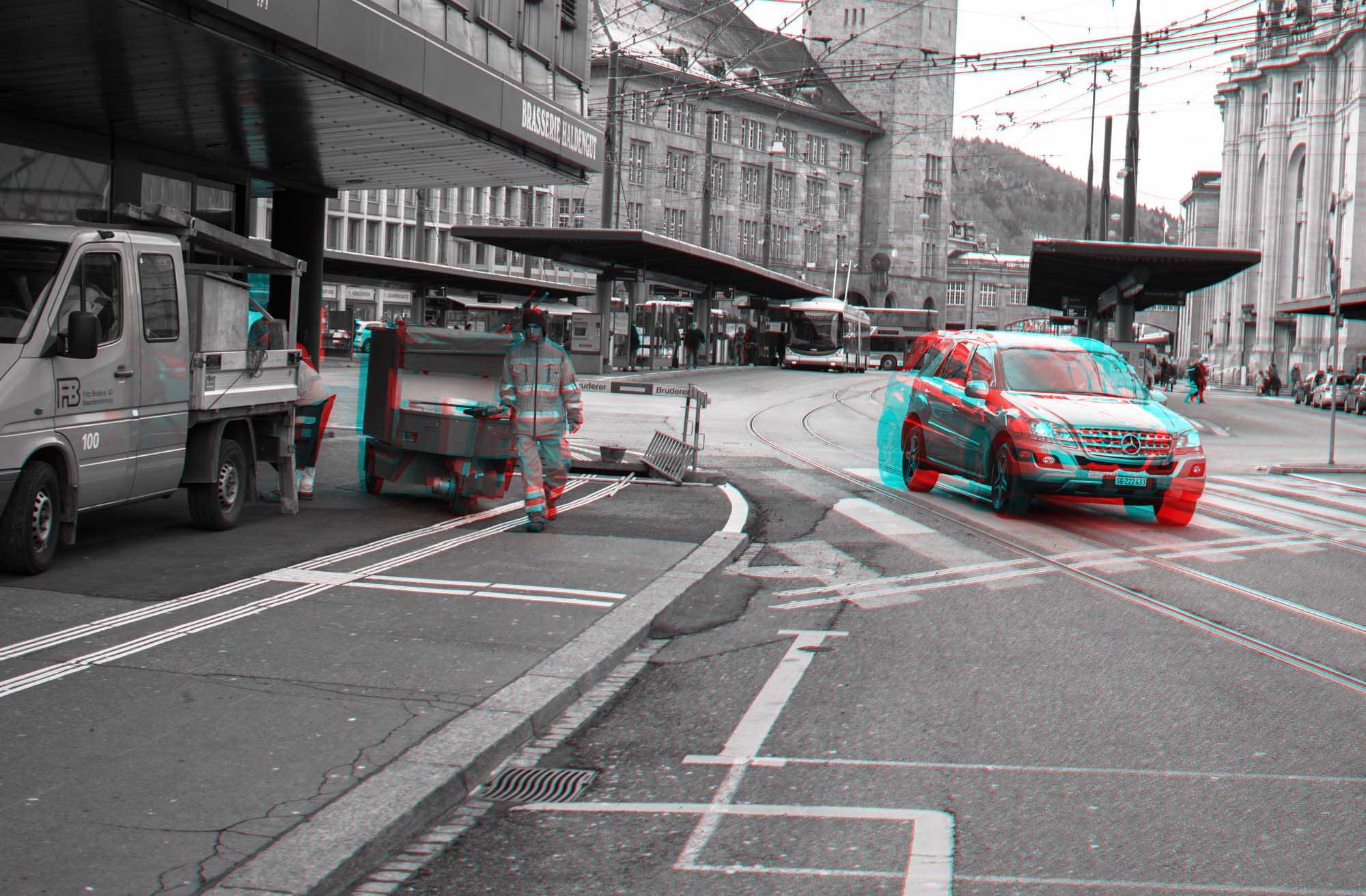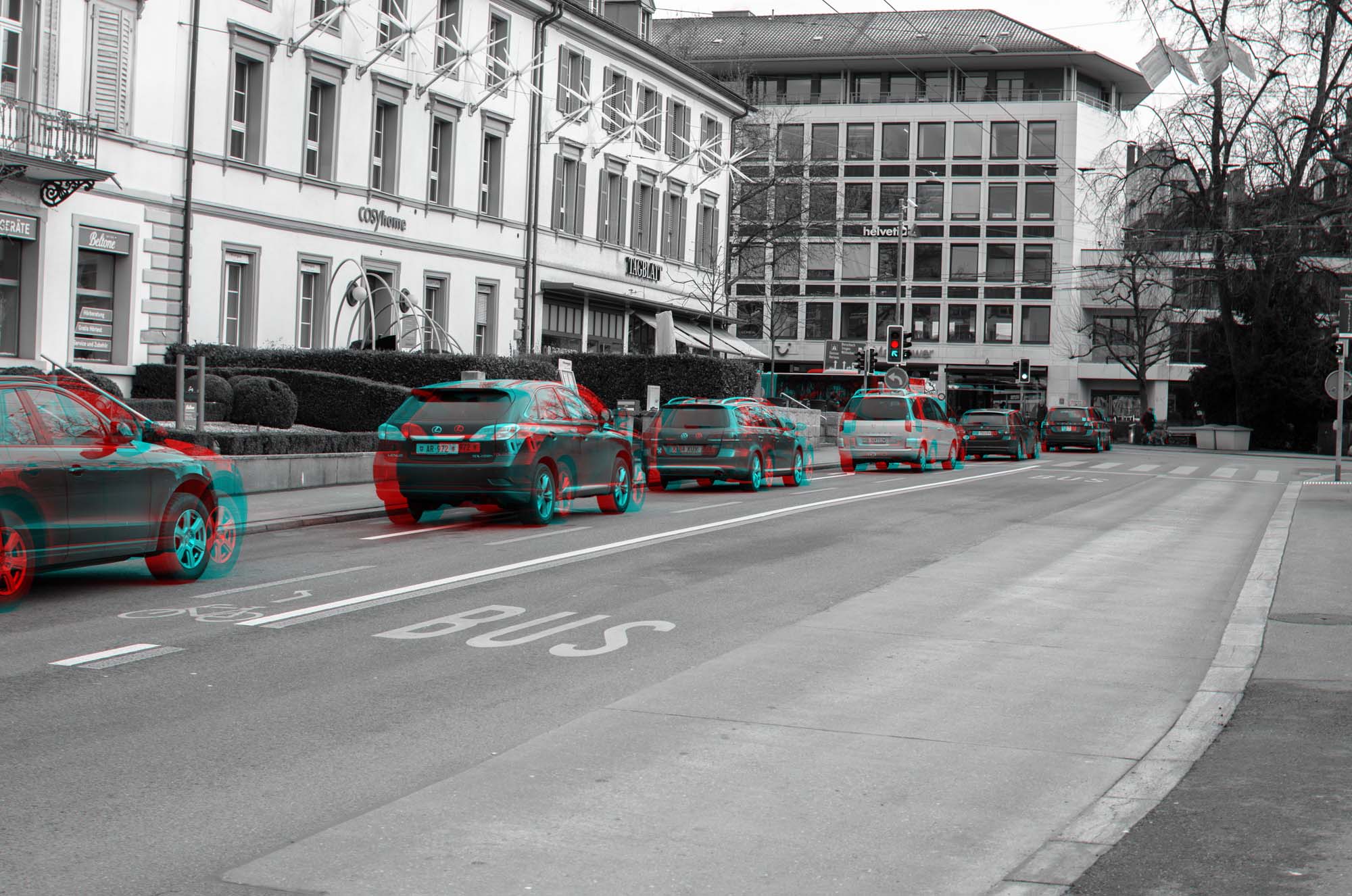 Eine cyan und eine rot eingefärbte Fotografie aus einem kurz versetzten Zeitpunkt ermöglichen in dieser Überlagerung die dreidimensionale Darstellung von Bewegung.
